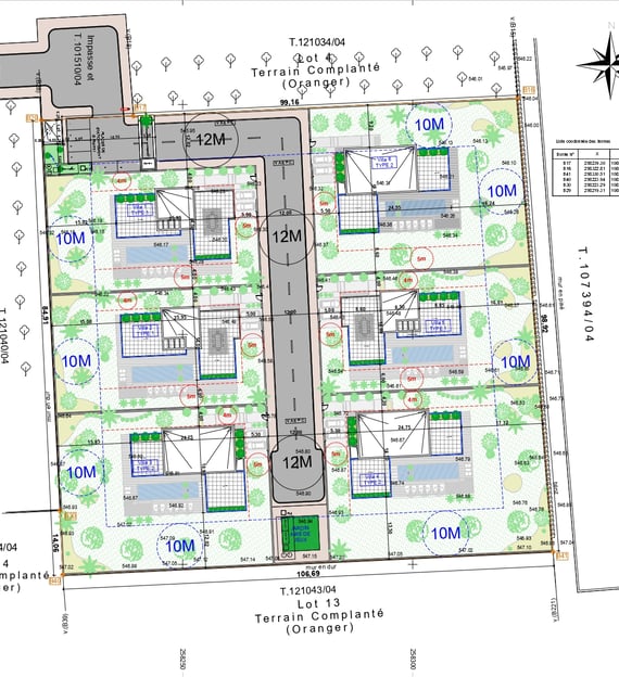 Visualisez l’aménagement du Domaine Oranger : 8 villas avec piscines privatives, jardins paysagers et accès central de 12 m. Un cadre harmonieux pensé pour le confort et la sérénité.